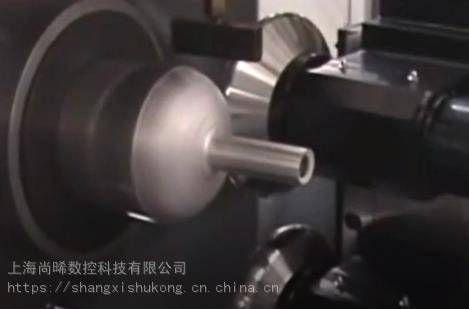 如上圖所示的氣瓶收口,其加工過程為將管形毛坯放在空心主軸中,需成形的管端伸出,并由液壓夾緊裝置夾緊,并通過旋輪架選裝。成形是從工件端口開始的。從工件端部開始,旋輪做往復(fù)擺動(dòng),每擺動(dòng)一次作軸向進(jìn)給,由于不斷旋轉(zhuǎn)壓縮,管坯口部直徑逐步減小。對(duì)于氣瓶的收口,當(dāng)頸部直徑達(dá)到要求后,用旋輪作平行于工件軸線的移動(dòng),使頸部延長(zhǎng)和旋光如需封底成形,則使旋輪擺動(dòng)不在頸部停止。