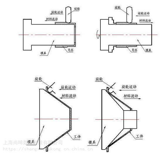 按照加工工藝,氣瓶的旋壓加工可分為兩種:正向旋壓(正旋)和反向旋壓(反旋)。正旋指材料的流動(dòng)方向與旋輪的進(jìn)給方向一致, 反旋指材料的流動(dòng)方向與旋輪的進(jìn)給方向相反。